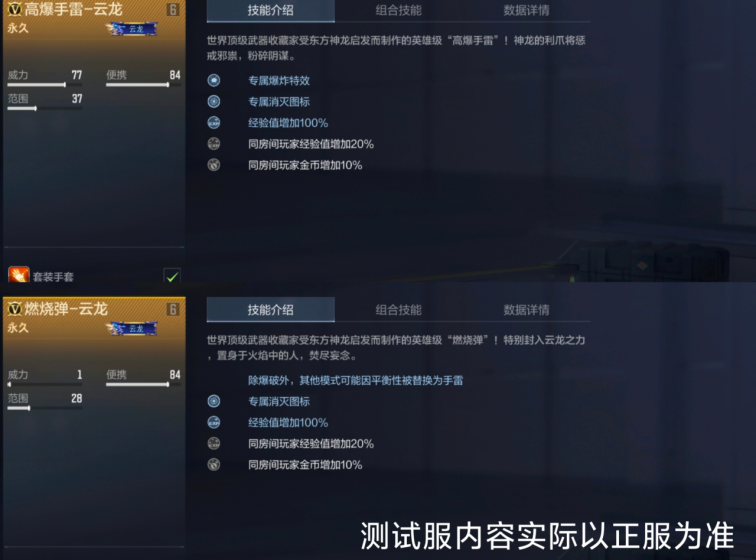 高爆手雷-云龙与燃烧弹-云龙是极具威慑力的投掷组合。高爆手雷-云龙拥有专属爆炸特效与消灭图标,能提供100%的经验加成,还能让同房间队友经验+20%、金币+10%。燃烧弹-云龙则能在爆破模式中持续灼烧敌人,也拥有专属消灭特效。