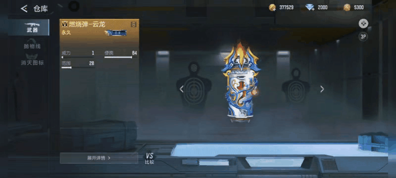 云龙燃烧弹则是蓝金交织的宝瓶造型,周身流动着火焰纹路。顶端燃烧的橙红色火焰特效,让它在静置时也充满威慑力。使用时,龙纹与火焰的呼应,极具辨识度。