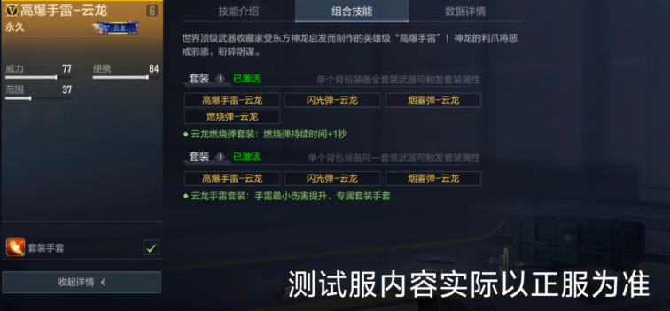 云龙投掷的组合技能特别实用,装备云龙套装后,不仅可以提升手雷最小伤害,解锁专属套装手套,还可以使燃烧时间延长1秒,可别小看这一秒,这一秒在对战中不仅能进一步延长其封锁时间给敌人造成伤害,又为我们在战斗中争夺了时间回防。