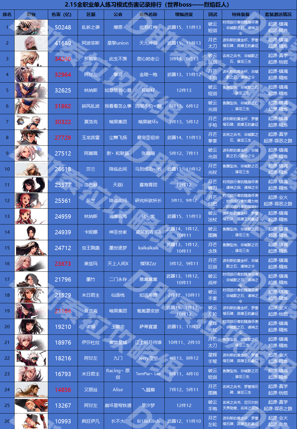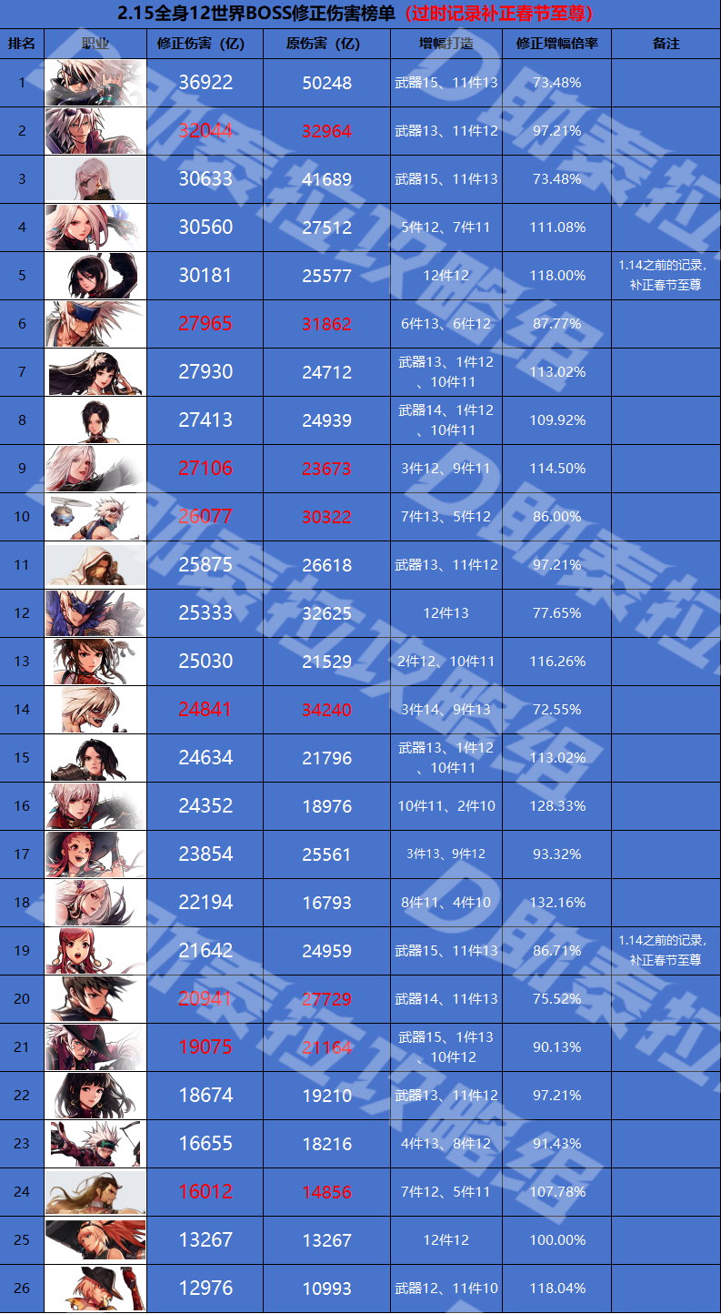 备注:上述排行将所有职业的增幅修正为全身12,已经加入增幅属性中的力智、攻击和技攻,个别更新前的数据额外补正了春节至尊的数据,男蓝拳单独补正了双起源的技攻数值,本排行的原伤害数据来源于每周统计的各职业单人世界boss伤害