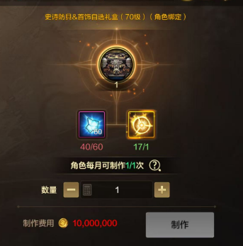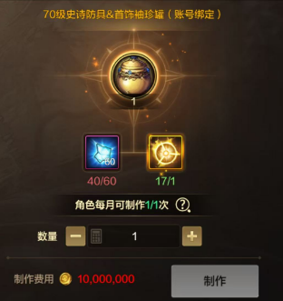 每个角色每月能做 1 个 “70 级史诗防具 & 首饰袖珍罐”,制作材料需要 60 个浓缩的魔能石。罐子是账号绑定的,做完后可以转给需要的角色,灵活性很高。