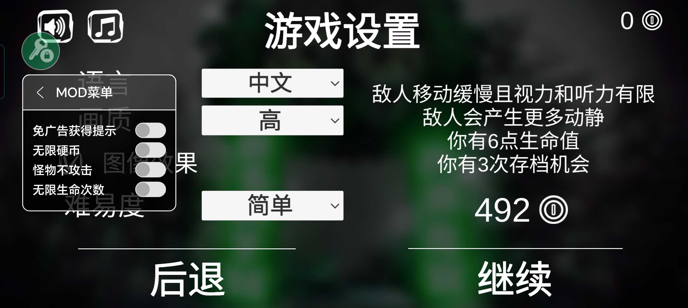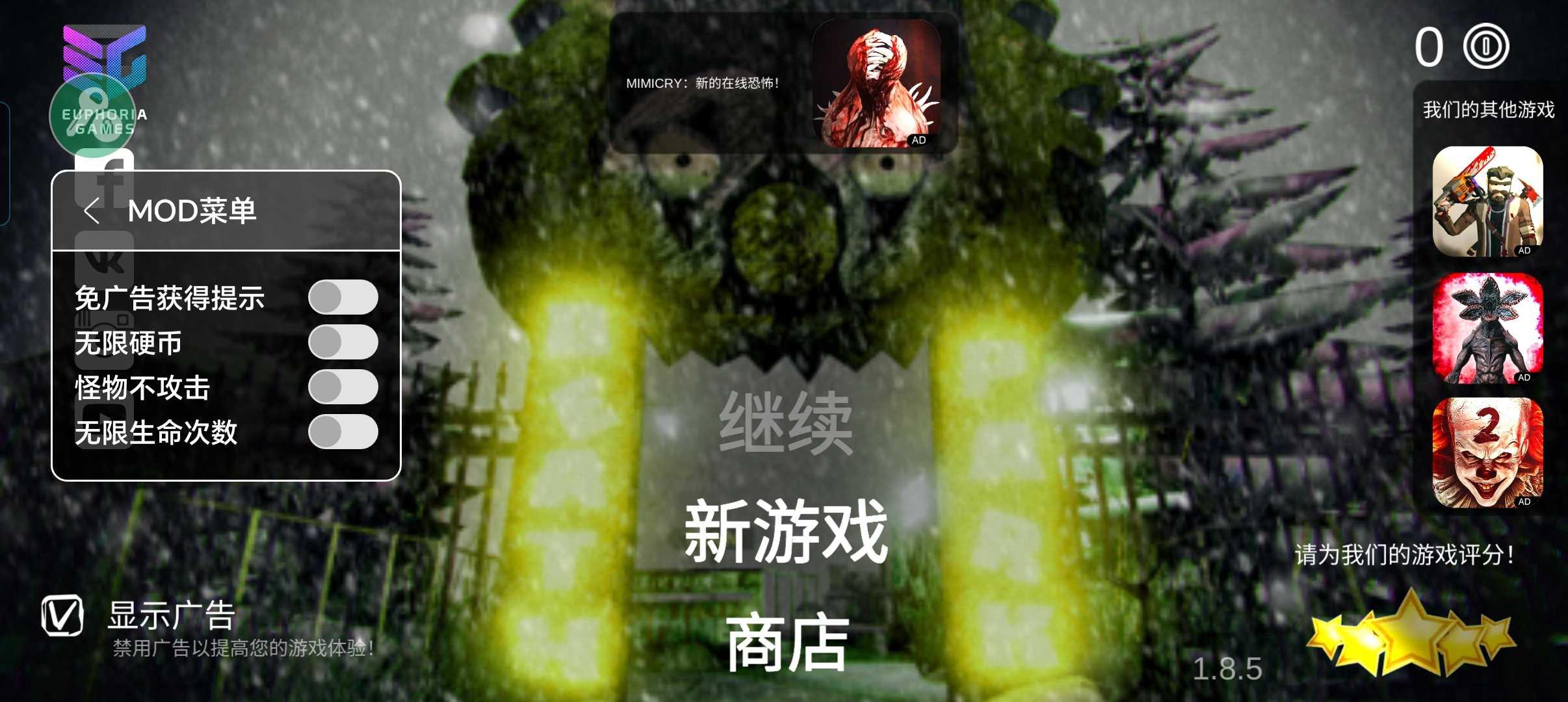 里面有各种菜单,有小丑不攻击,还有免广告,还有无限子弹《进去之前记得断网》不然非常卡~