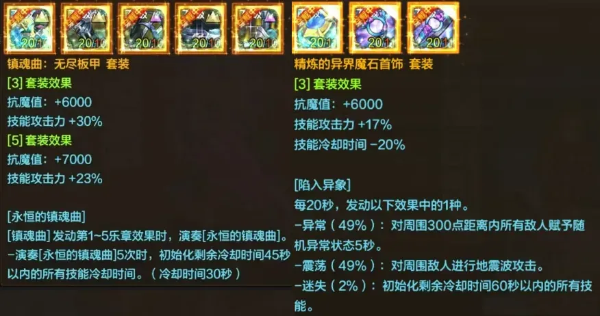 这一套搭配的核心为“镇魂曲+精炼套”,2套装备都是侧重于冷却和重置技能的,运气好连续触发,这就是“无限火力”!