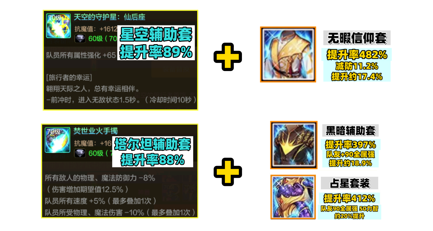 两套辅助首饰表现都不错,和防具进行混合搭配,体验最佳。例如占星就配减防首饰,信仰就配星空首饰。