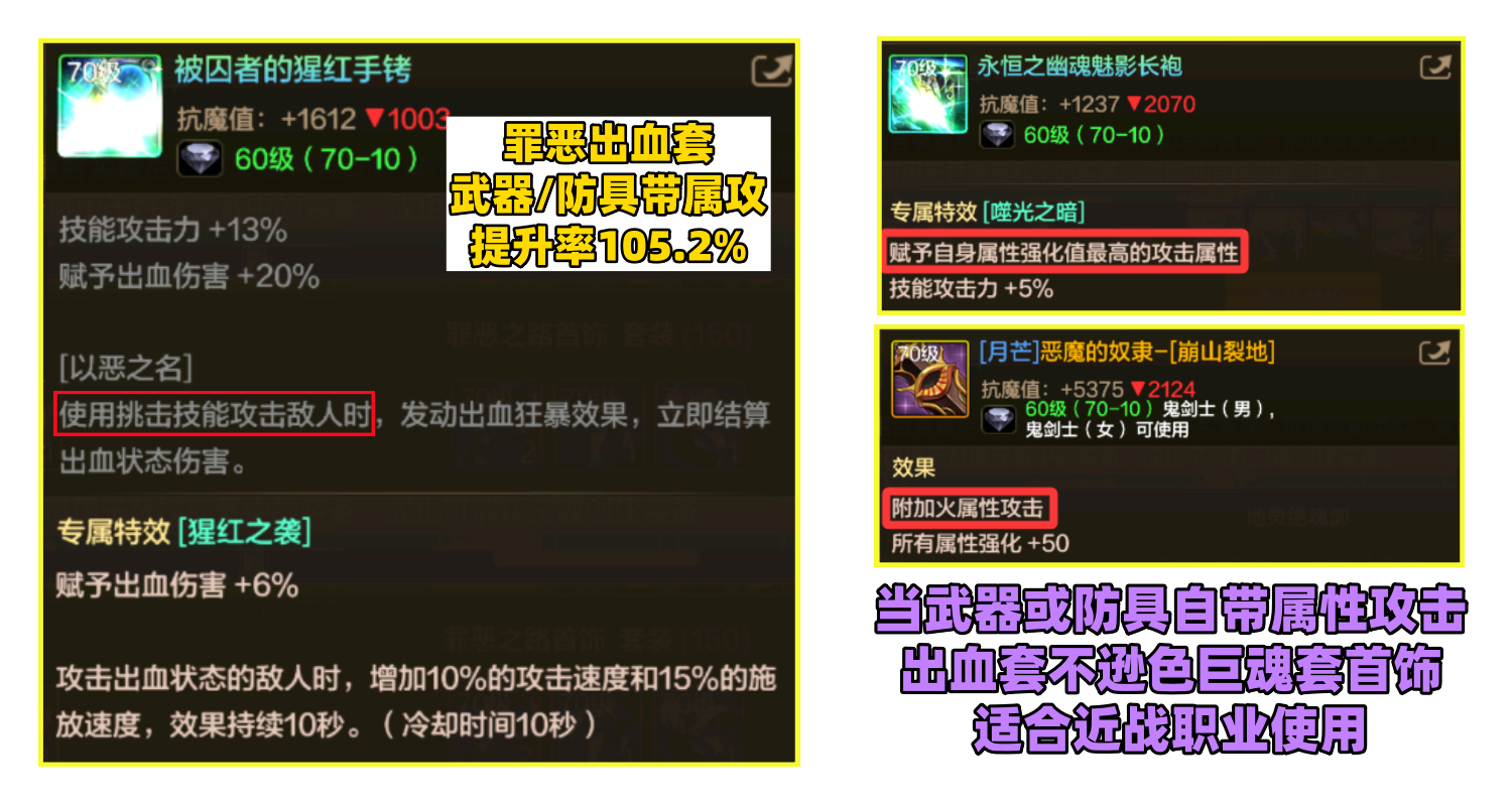 罪恶之路出血套,目前存在BUG部分职业会丢失大量出血伤害。如果你是近战职业,武器或防具自带属性攻击,那么出血套毫不逊色于巨魂套,可以称之为最强首饰之一,非常契合被动没有爆伤的近战职业,这套首饰要用上挑来提前结算伤害。