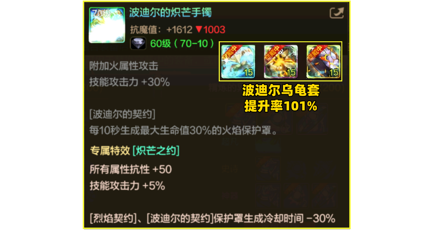 波迪尔王八套,严重被低估的首饰。配合本命套高额血量,无论在雷龙还是后期安徒恩,7秒1次的护盾拥有极好体验感,高暗抗也完美契合幽魂防具。