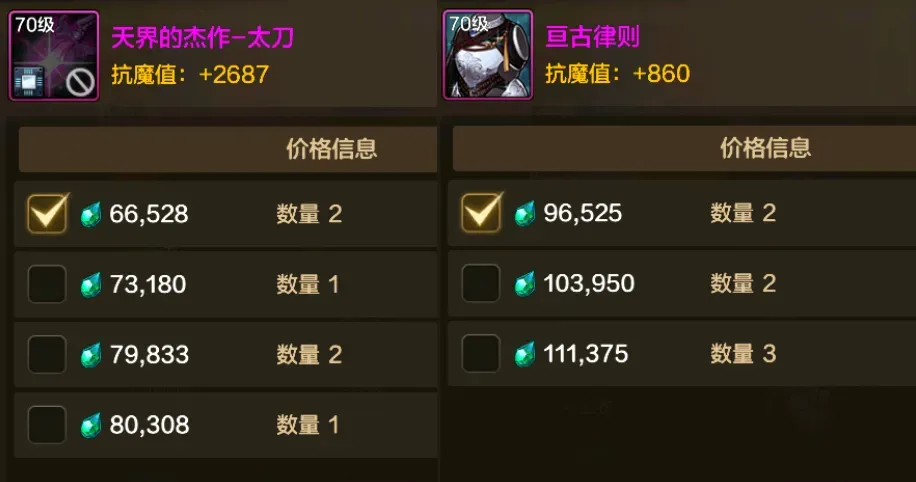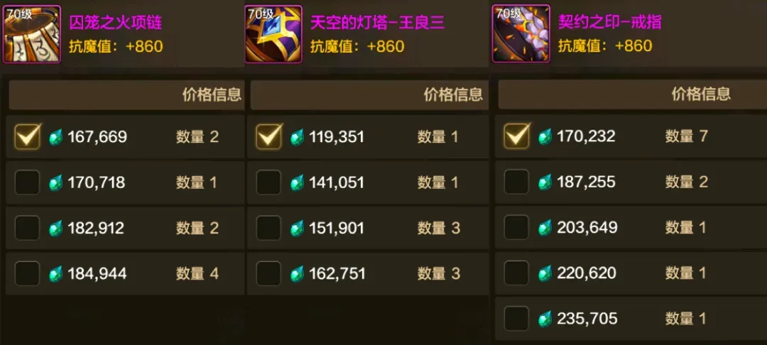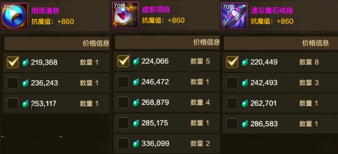 但让我们再来看一下“神器首饰”的价格,基本上都在10万泰拉以上,就算是不那么出名的乌龟套、意志套,价格也基本上都在10万泰拉以上。