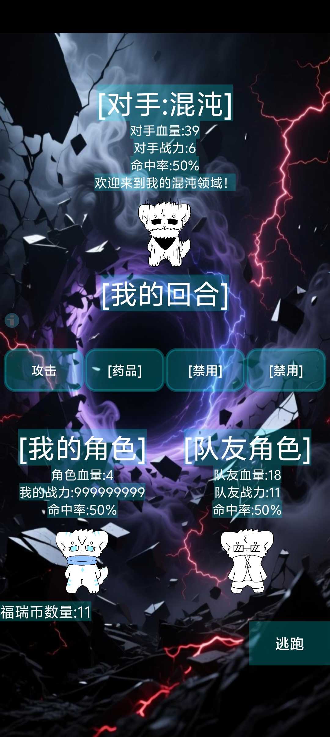 [游戏介绍]:这是一款由作者独立开发的自制回合制角色扮演赌运游戏,一个靠运气、血量、装备、战力战胜对手赢得奖励的回合制游戏,玩家不仅需要在战斗中靠运气躲避对手的攻击,也要靠丰富的战斗资质战胜对手赢得奖励...... [更新内容] 版本1.33更新内容 新增匹配挑战模式对手"混沌",新的对话内容,修复已知bug 版本1.3更新内容 增加新的装备,玉佩:龙玺,装备时血量+4 获取方式:装备商店,新增匹配挑战模式,可以匹配队友一同作战啦! 版本lv0.999更新内容 由于关卡难度问题,删除了对手技能等功能,大幅度降低关卡难度,修复对话框无法显示等问题... 版本lv0.9更新内容 新增第四期角色,第四期抽奖内容,第四期角色获取方式:第四期抽奖,碎片工坊,新增四个角色不同的技能和两个被动技能[冻结][双重冻结][冻雨][感染][嗜血] 版本lv0.6更新内容 新增boss:暴走砂立(三阶),boss专属对话内容,新的bosd挑战机制[感染]:被食兽病毒感染会增加饥饿感和饥饿伤害,两把新的武器(天堂之锤)和(水晶之剑),增加部分角色技能和使用等功能,优化武器图鉴界面 版本lv0.3更新内容 新增第三期角色抽奖内容,新增第三期角色分别是矇、矇(单剑)、矇(双剑),暴走砂立(二阶),第三期角色可在碎片工坊内兑换 版本9.666更新内容介绍 修复已知战斗系统和对话框不显示等bug,增加角色选取颜色显示,由于福瑞商店商家内斗闹矛盾,现已将福瑞商店分为武器商店与装备商店,新的装备[护身符]:炁影,装备时永久增加额外三格血,获取方式:在装备商店里购买即可... 版本9.333更新介绍 新增战斗界面药品功能和福瑞药店界面,目前大概只能够在冰天雪地里地图或砂立二阶战斗时才能使用药品功能,新增灵珠丹药,灵珠丹药使用效果对战时增加1血,灵珠丹药的获取方式在福瑞药店里购买即可,修复已知战斗bug 版本6.99更新内容介绍 新增地图(冰天雪地),新的挑战对手,冰雨(一共有三个阶段),新的战斗机制[冻结]:改变回合,设置战斗结算后的福瑞币奖励为随机,关数越高随机奖励数越高,奖励对手战力难度,设置对手初始血量与我的兽设角色血量同步,优化新地图战斗界面,修复已知bug,签到奖励调整 版本6.66更新介绍 新增挑战角色矇和专属bgm(矇一共有三个阶段可供挑战),新增矇的对话内容每个阶段都有不同的