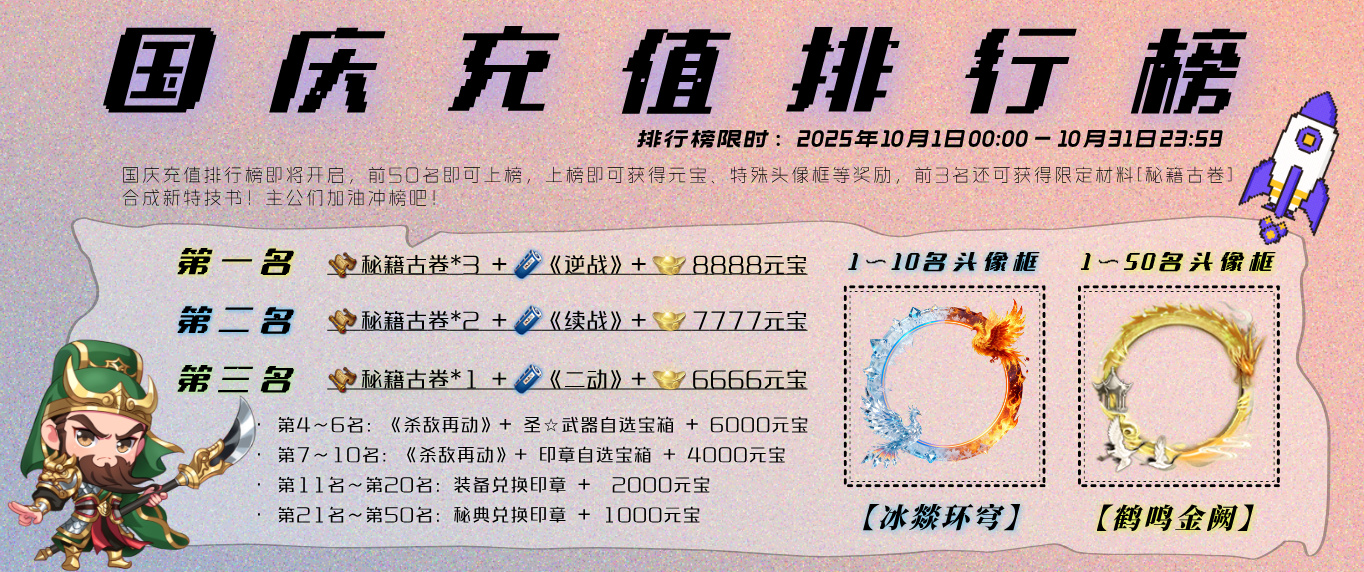 活动说明:国庆充值排行榜即将开启,前50名即可上榜,上榜即可获得元宝、特殊头像框等奖励,前3名还可获得限定材料[秘籍古卷]合成新特技书!主公们加油冲榜吧!