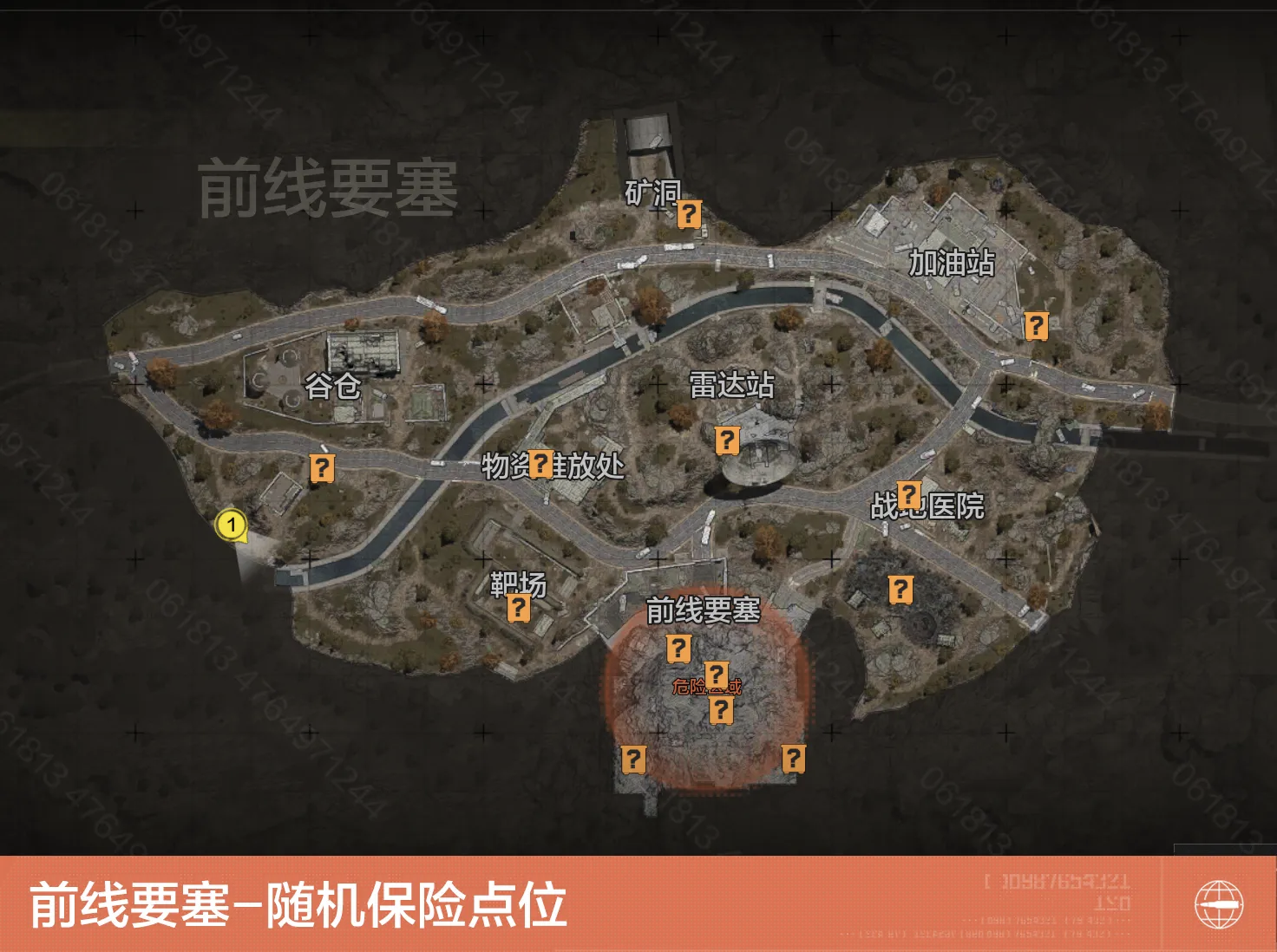 前线要塞地图中共有13处随机保险刷新点,分别位于矿洞、加油站、谷仓、物资堆放处、雷达站、靶场、战地医院、前线要塞内部。