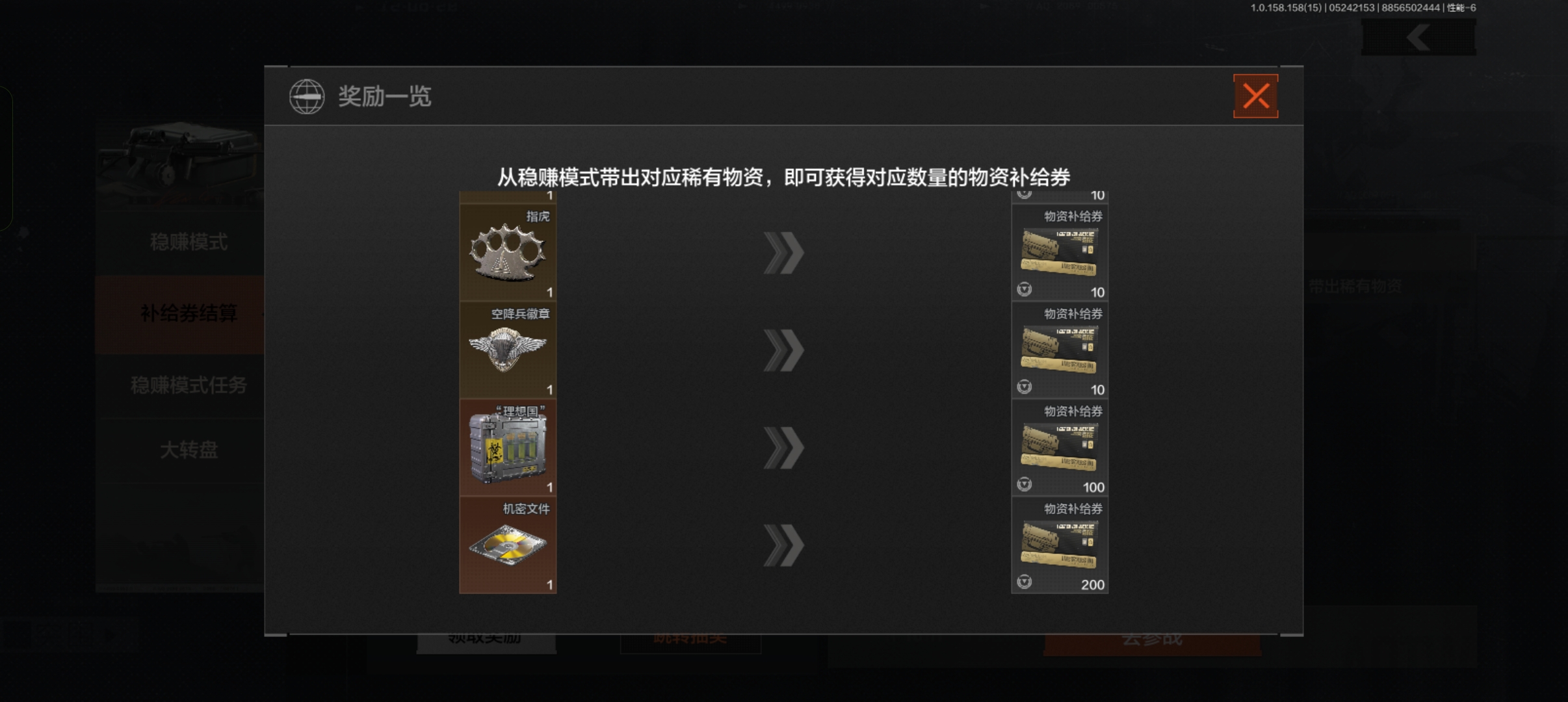 带出稀有物资可参与抽奖,小金基本1个=5物资补给券,1个首领信物=15券,1个大金=10券。