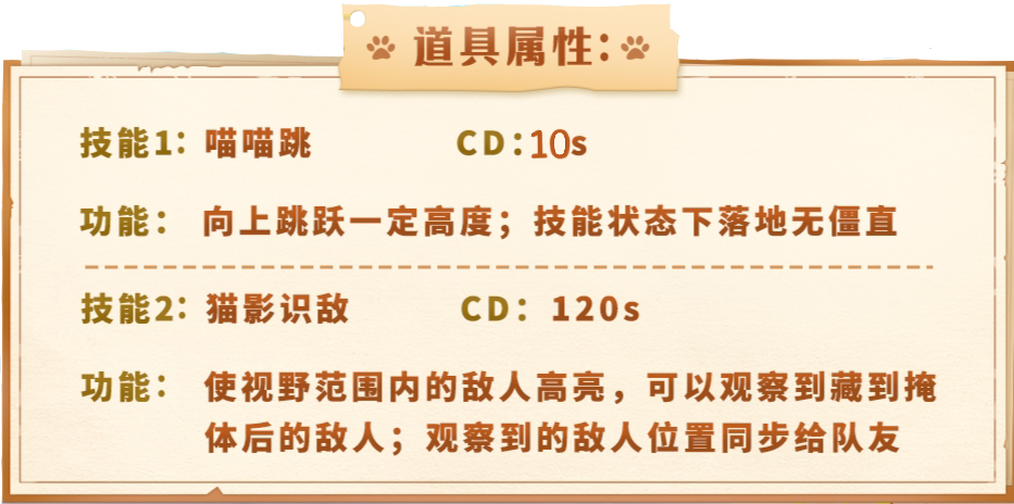 1、猫猫身份卡:1技能可以直线跳一段高度