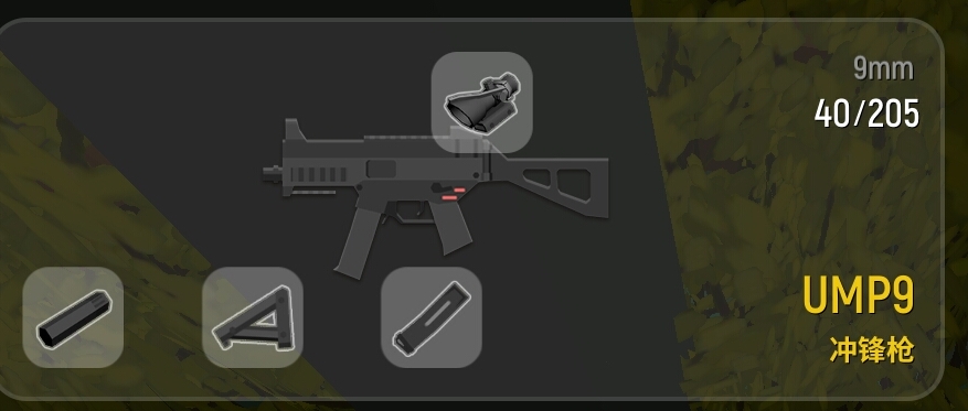 倍镜:2倍镜,4倍镜(可以选择红点或平息代替,这里要注意UMP9的倍镜最高只可装到4倍镜)