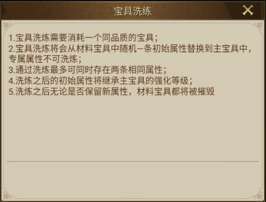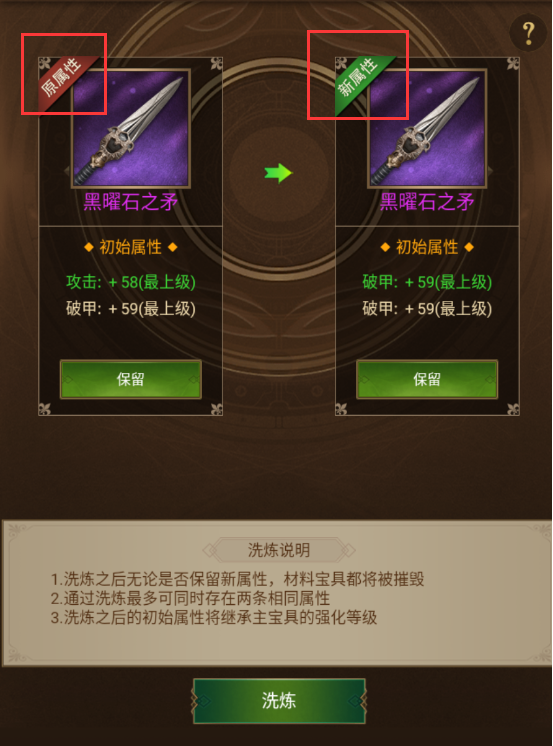 tips1:如果洗练出的属性自己不喜欢,可以选择保留原属性,大家操作的时候要注意呀~ tips2:只要宝具的属性等级提升,那么宝具的品级也会提升。比如原本带两条下级属性的紫色宝具,把两条下级属性洗练为上级后,宝具的品级也会变为上级;