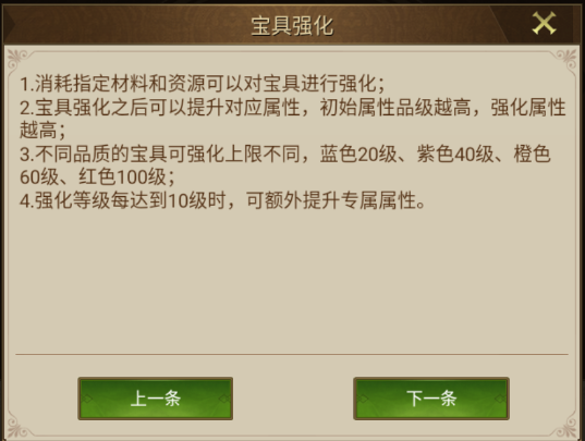 从打造消耗需要的材料可以看出,宝具打造跟装备必须要装备图纸不同,宝具打造需要的材料都是关卡可以获得的,而且不需要打造时间。所以~~如果条件允许的话,大家可以考虑直接搞红色的宝具哟~因为红色的宝具可强化的等级上限是最高滴~