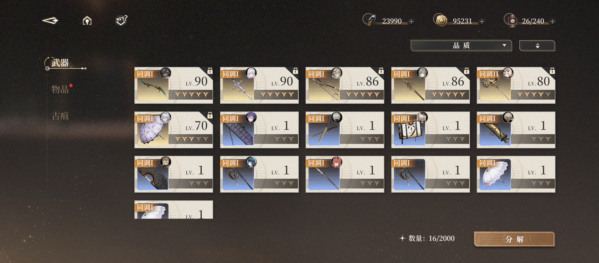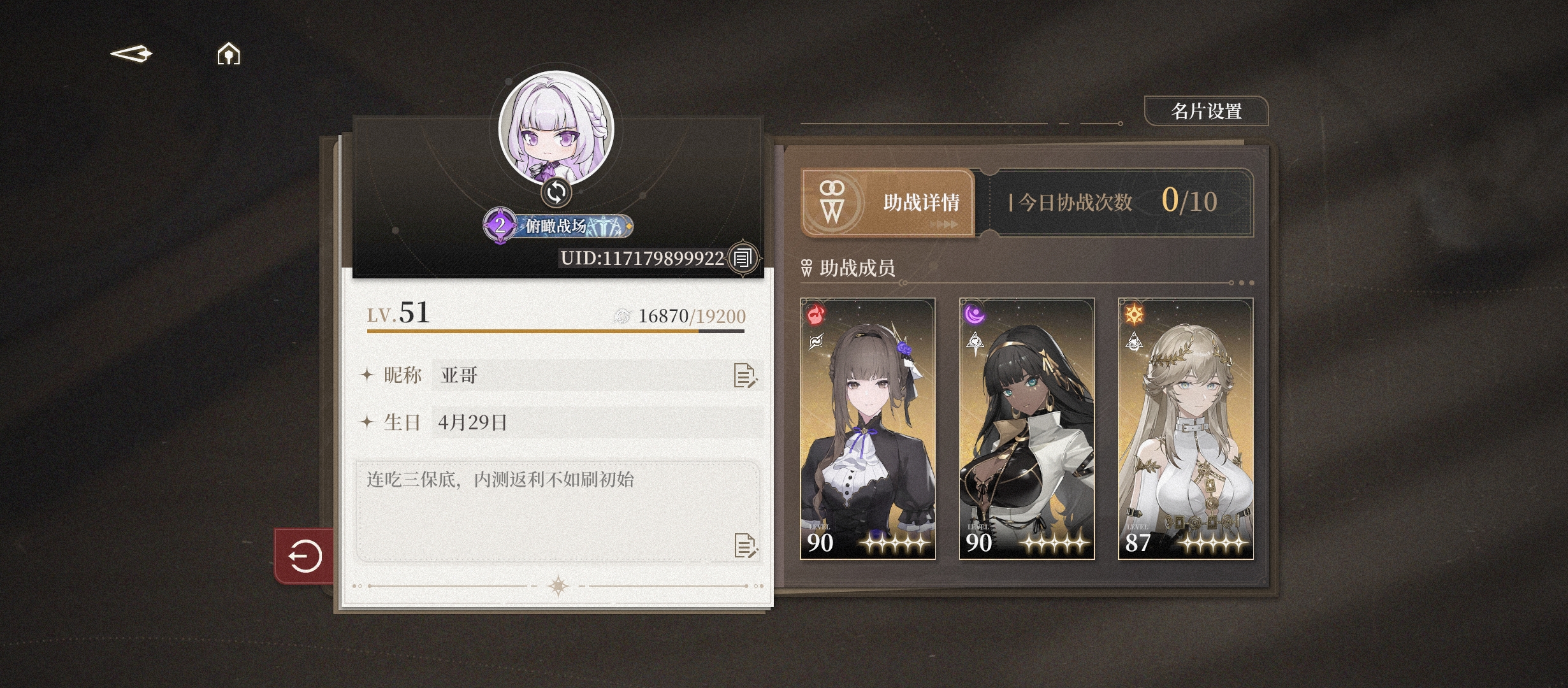 然后有关账号的练度,主播用完了送的所有体力,练度勉勉强强。只练了6个角色,每个角色都有配备专武。