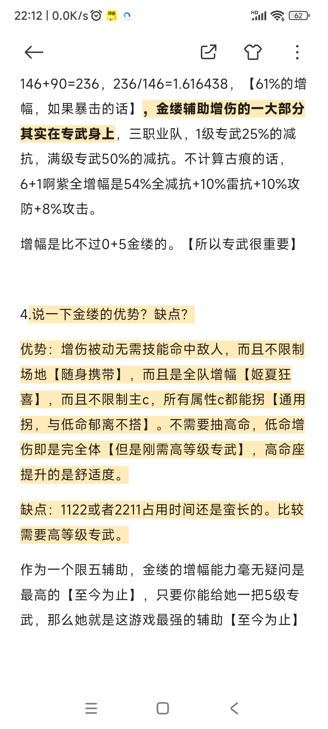 3.最后金缕的1技能增伤其实并不算很高,古痕全光伤也才31.9%,一级专武7.2%,10级技能给的增幅也就(31.9+7.2)*1.5=58.65%【这增幅能不能比的过水奶的90%爆伤还是个问题】90%的爆伤对于常规双爆主c146%爆伤的增幅是146+90=236,236/146=1.616438,【61%的增幅,如果暴击的话】,金缕辅助增伤的一大部分其实在专武身上,三职业队,1级专武25%的减抗,满级专武50%的减抗。不计算古痕的话,6+1啊紫全增幅是54%全减抗+10%雷抗+10%攻防+8%攻击。