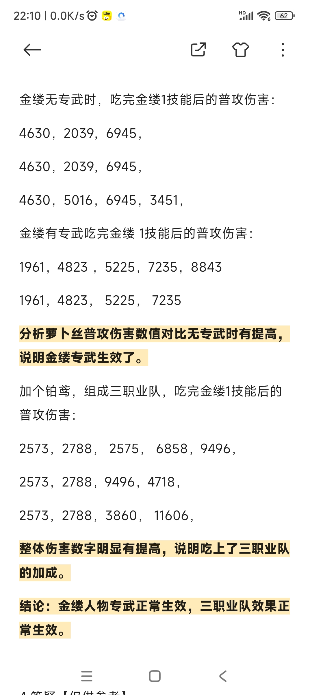 分析萝卜丝普攻伤害数值对比无专武时有提高,说明金缕专武生效了。