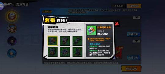 分别为两套:过载套,弱点套,推荐搭配:过载头盔,过载护手,过载心核,过载鞋子,弱点衣服,弱点背包(配合三一,射速又快,范围又大,清图很快)