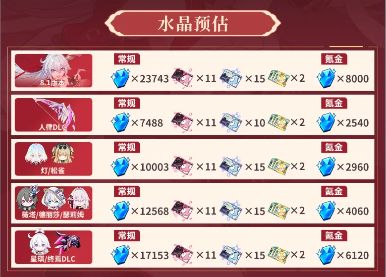 角色卡需要约4.5万水晶(家园卡数量不影响获取角色卡的水晶档位),一枚角色晋升印章价格约9520水晶。家园最多可计入20卡,合计可获取20代币。下表为对应卡池结束前的水晶获取量预估,小伙伴可根据实际需求作好水晶规划。