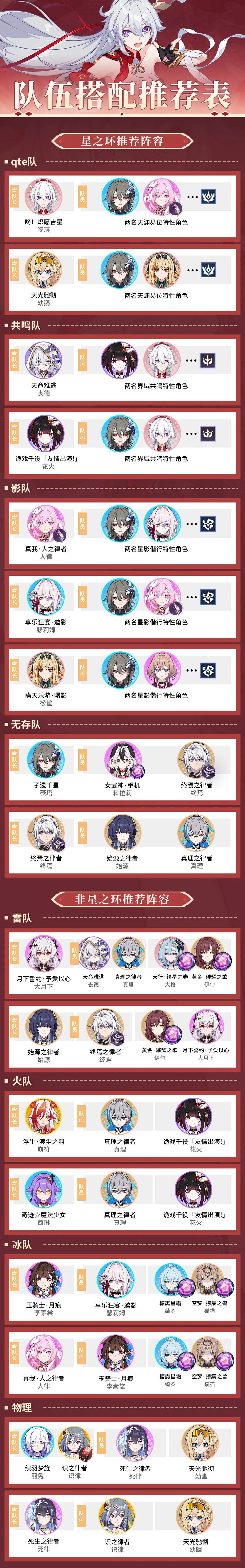 以下是参考推荐阵容,新人一口气获取齐全的队伍确实困难的,而第二部角色大多会横跨多种类型的队伍,所以参考阵容更多的是一个方向的指引,方便寻找对应队友,以及找到自身BOX中高质量角色,围绕其进一步培养更多类型的队友。