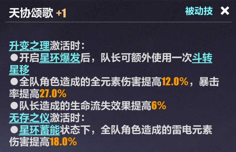 S阶即可解锁核心效果:开启星环爆发后,队长可额外释放一次特殊qte,总共能用两次。此外还能提供回复星之环能级、赋予敌人易伤等效果。
