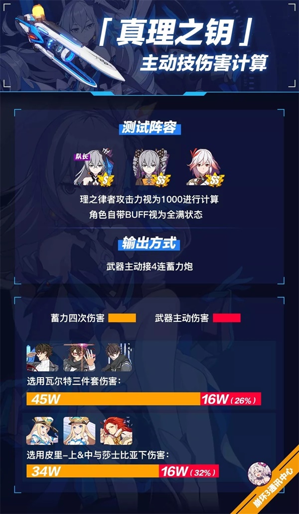如果想拿理之律者输出,真理之钥为必须品(指必须抽)。一方面是其主动技强,另一方面是其下位替代少,不像空之律者还有一把幽色咏叹调可以使用。