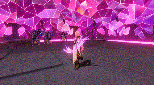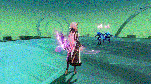 「识之律者」通过开启必杀技引爆闪避后的分身触发时空断裂以触发「粉色妖精小姐♪」的QTE,在「粉色妖精小姐♪」QTE的同时释放「朔夜观星」的必杀技,「粉色妖精小姐♪」落地后立即使用武器主动,降低自身必杀技SP消耗后开启必杀技,并连续释放蓄力攻击穿插武器主动输出至【无瑕穹顶】效果消失。