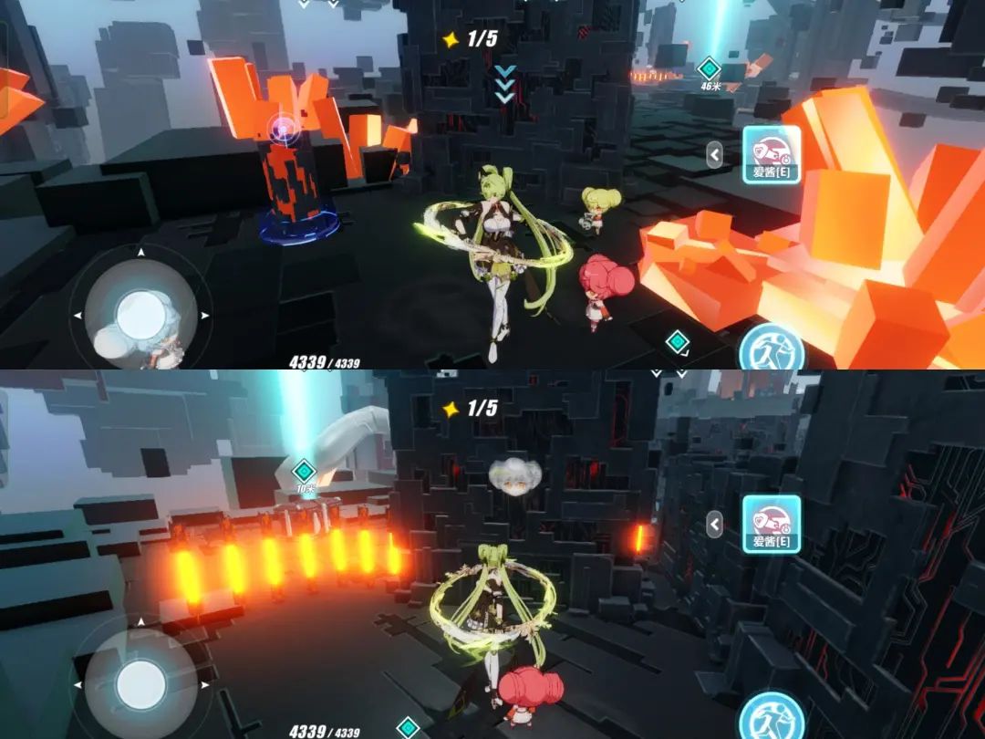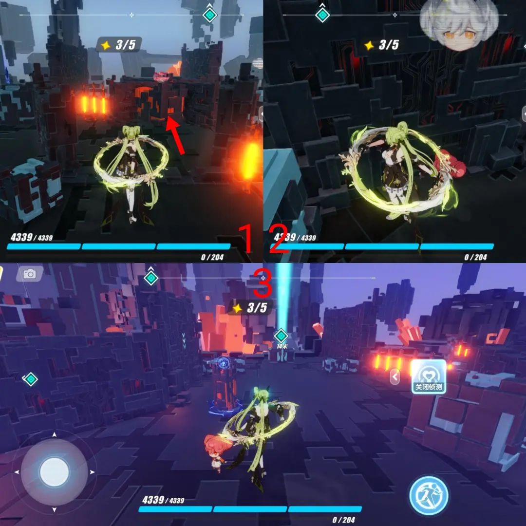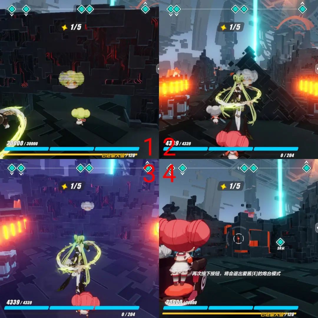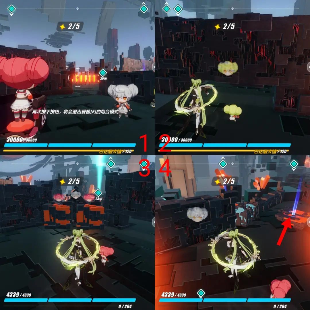 向后看用爱酱[E]轰开障碍(图1),顺着转盘来到图2墙壁,开启爱酱[P]消除后即可看到区域机关和宝箱4。开启区域机关前往区域6。