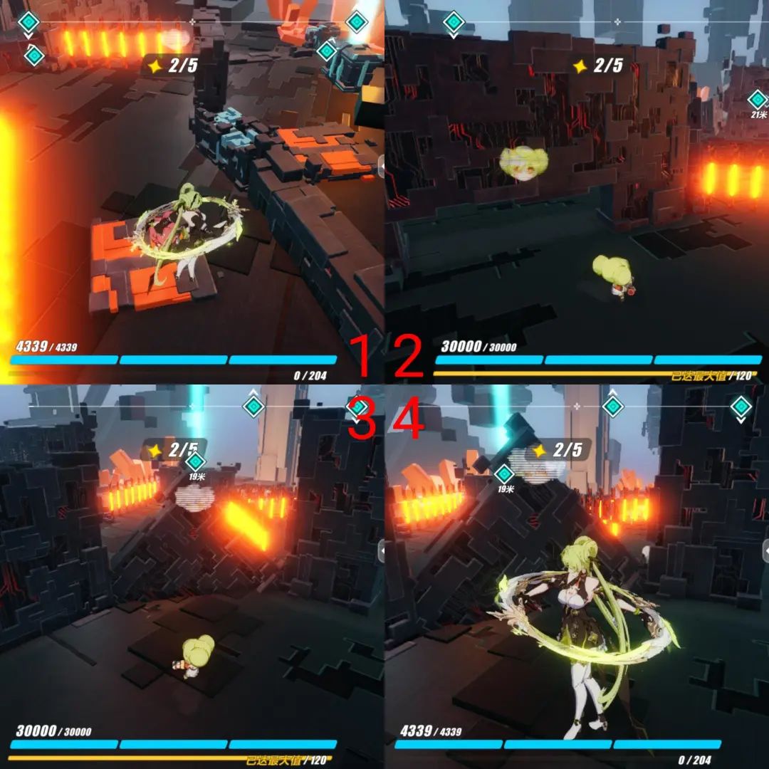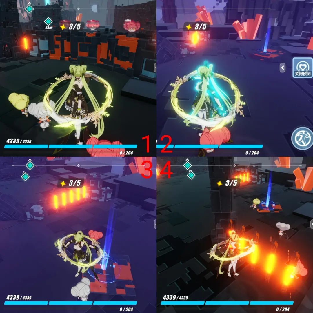 用爱酱[E]消除障碍(图1),开启爱酱[P]消除墙壁看见橙色踏板(图2),踩下橙色踏板(图3),随后关闭技能,切换为爱酱[O]后交换位置(指连按两次爱酱O技能),即可看见爱酱[O]踩下橙色踏板,但管理员在墙外(图4)。
