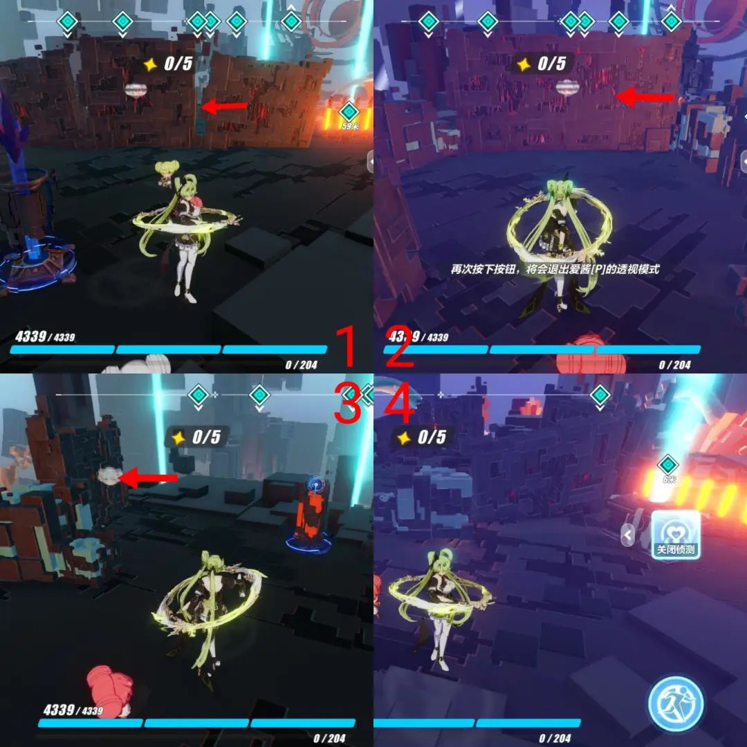 先用爱酱[P]技能消除图1红色箭头所指墙壁,穿过后取消技能消除图2墙壁,就能看见区域机关。在这里左转开启技能消除红色箭头所指墙壁(图3),即可看见宝箱1(图4)。