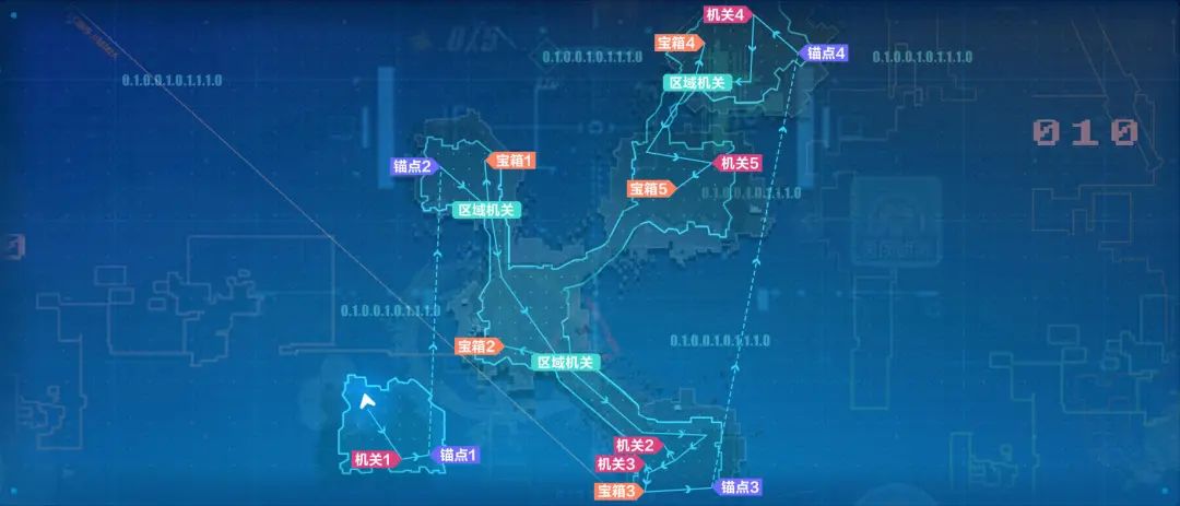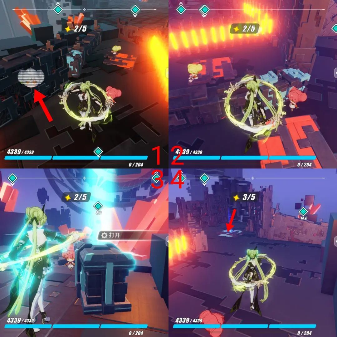 沿着转盘前行就能看到区域机关,打开即可前往区域4。在前往区域4前,回头往左看能看到宝箱,同样需要开关爱酱[P]技能穿过障碍拿到宝箱2。