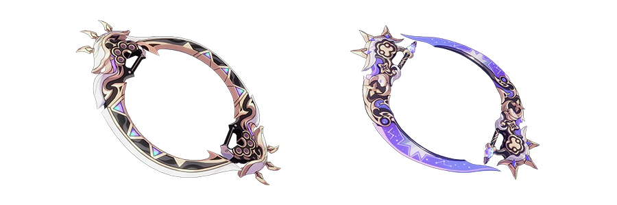 「往世的幻梦」&「往世的幻梦·夜之瞳」是5.6版本实装的环刃武器及其超限形态,能够在携带者离场时留下冰霜结晶,持续对敌人造成冰冻元素伤害的同时提高全队角色的冰冻元素伤害。被动可提升自身与全队角色的全伤害,超限后可降低队伍中具有冰冻元素伤害特性角色的必杀技冷却时间。