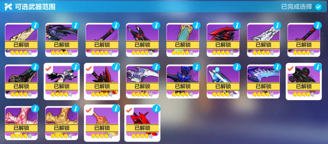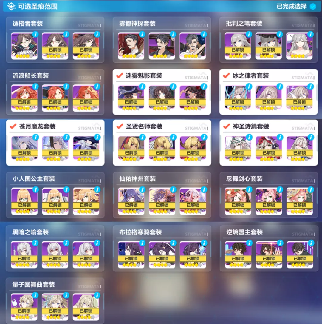 圣痕池就比较一般了,许多圣痕都已经可肝,再抽显然不太划算,即使是一些不能肝的蛋池圣痕要么进入过BP要么使用率不高,如果要抽推荐补齐三件套比较好。如果想要指定获得一件装备,记得选择已解锁的武器和圣痕来作为池子的内容~