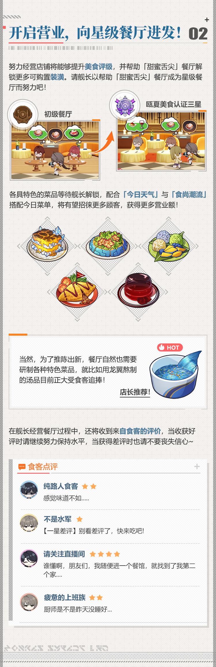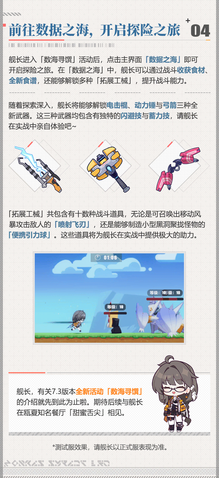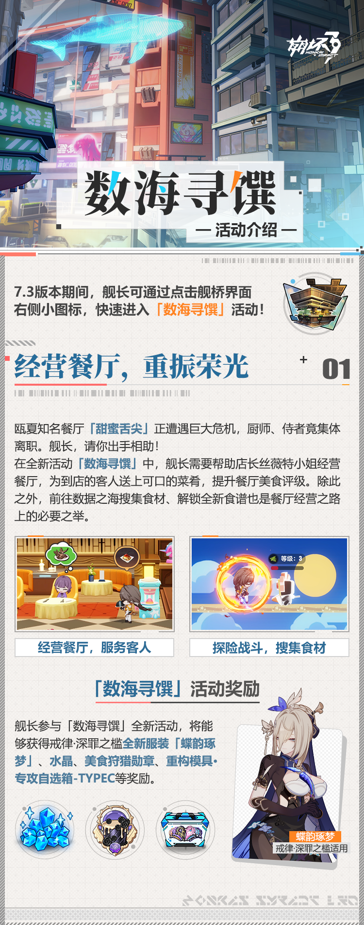 舰长好,在即将更新的7.3版本期间,将开启全新活动「数海寻馔」。舰长参与活动将可获得戒律·深罪之槛全新服装「蝶韵琢梦」、水晶、美食狩猎勋章、重构模具·专攻自选箱-TYPEC等奖励。