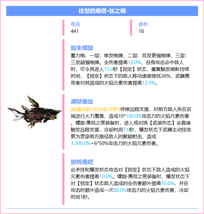 专属武器[往世的绝塔·丝之梯]对'螺旋·愚戏之匣'有非常高的加成,同时有很高的主动伤害。