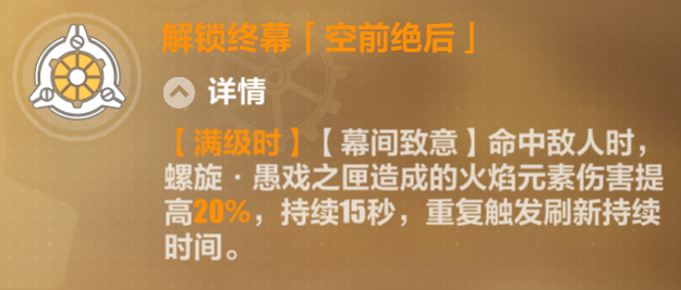 自身生成召唤物或销毁后提供独立火易伤并减少减伤极限闪避技能的冷却时间,由于'螺旋·愚戏之匣'输出方式是出场生成武装,进入爆发状态也是生成武装,因此可以认为该易伤效果为常驻存在。