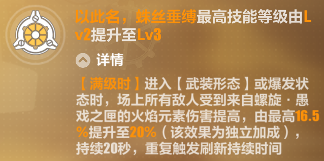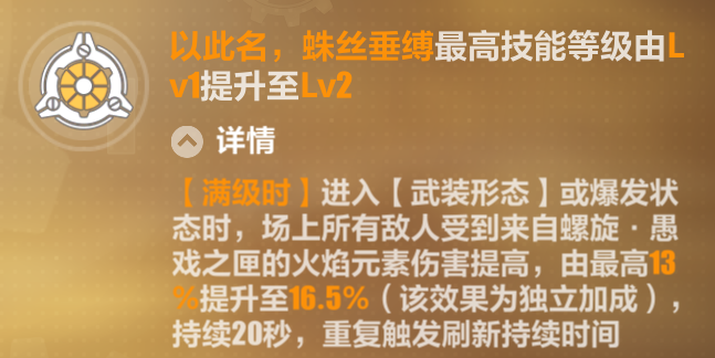 S2阶时,'螺旋·愚戏之匣'提升独立易伤数值和[武装形态]的蓄力伤害,并且提升[此刻,高潮将近]状态的能量回复速度。
