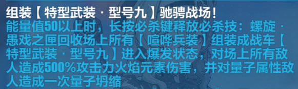 '螺旋·愚戏之匣'释放大招的第一段可以对量子属性敌人造成一次量子坍缩,并进入爆发状态,[武装热值]替换为[战车热值],[战车热值]充满时长按攻击键会触发[幕间致意],同时触发极限闪避技能。爆发状态下前5秒每秒减少5点能量值,之后每秒减少15点能量值,最大持续16秒。在爆发状态下能量耗尽,持续时间结束或者再次释放必杀技均会进行自毁爆破,此时为时停状态。