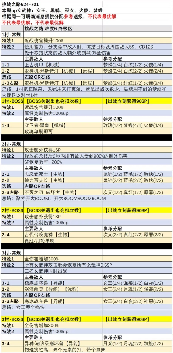 本次攻略难度主要参考高级区难度5以及终极区难度6。每个人女武神的练度不同,中配阵容无法通关时最好根据自身情况提高配置,终极区玩家可以直接参考文末的高配一图流。