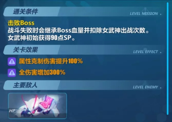 普通关卡通过检查点后会扣除女武神使用次数,武器和圣痕依然会被锁定,BOSS关卡女武神入场初始自带90SP,减小了通关压力。