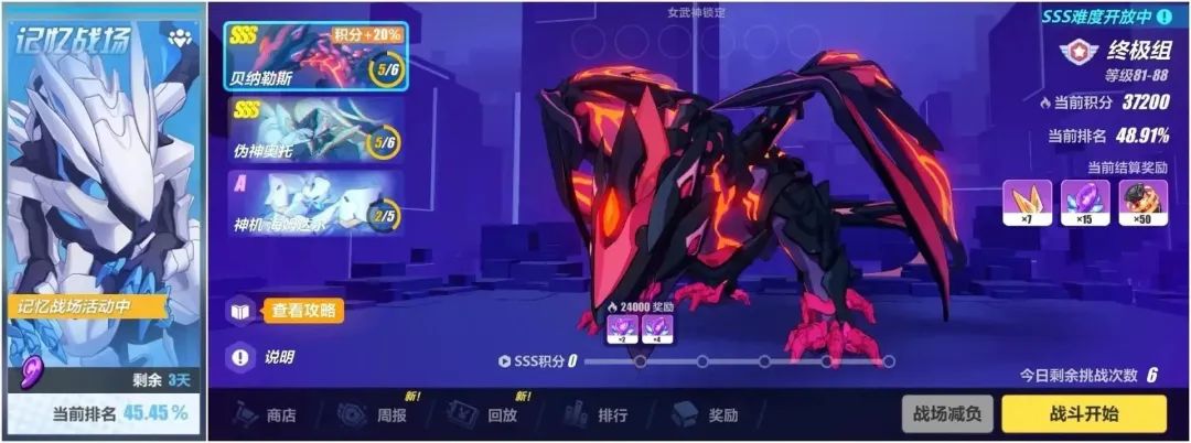 在战场中,每周二会开放两到三个强敌的挑战,通过挑战强敌可以获取积分,挑战难度会随着挑战获胜的次数逐渐上升。在完成一定次数的挑战后能够获取次数奖励,根据每周一四点结算时的挑战积分排名也可以获取排名奖励。