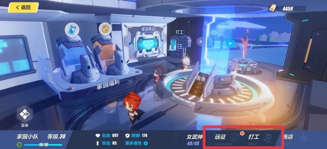 家园系统中,则主要关注右下角的“远征”与“打工”。
