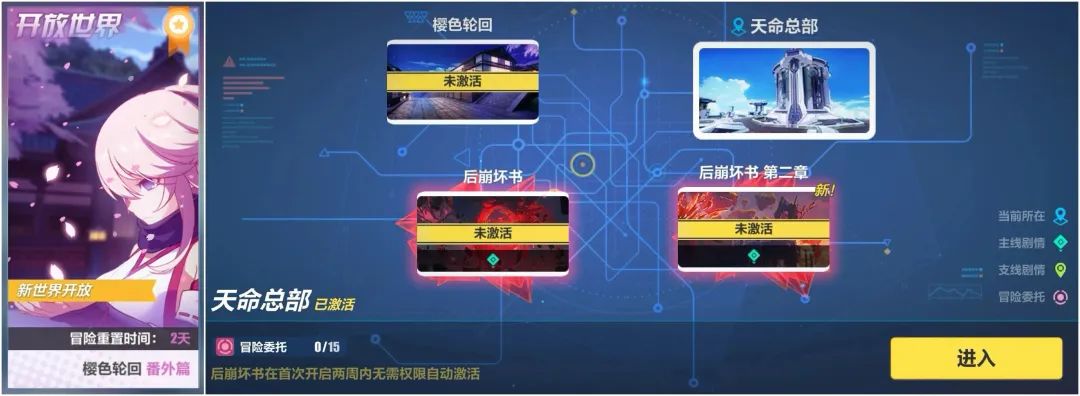 开放世界将会在18级时开放,其中可以分为两个部分,分别是主线剧情模式及冒险委托。其中冒险委托以周为单位,会不断地刷新委托。各个地图都有各自的主线剧情可供体验,而开启主线需要通过完成冒险委托提升的地图等级。