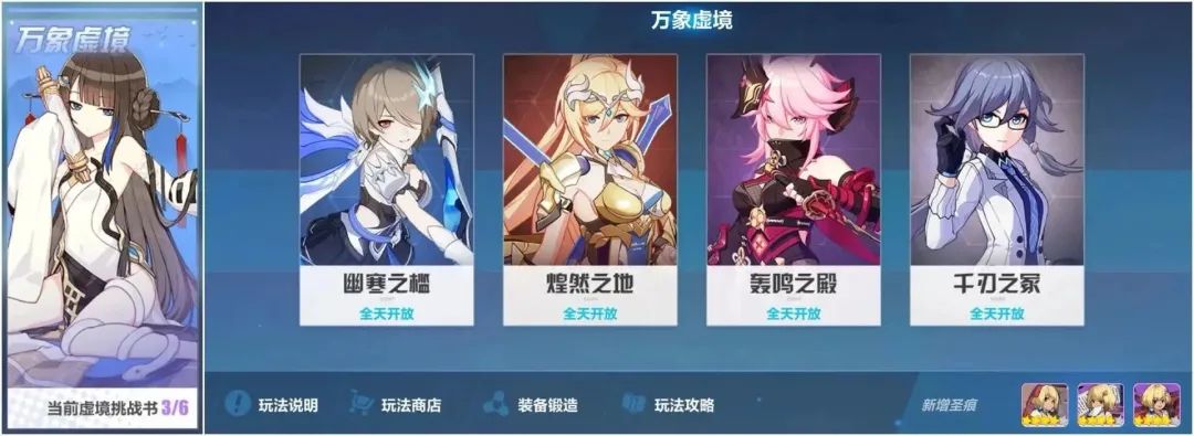 崩三的各种玩法可以简单分为常驻与活动两个部分。其中常驻主要包括了日常游玩时需要完成的玩法,它们往往会随着时间进行刷新。