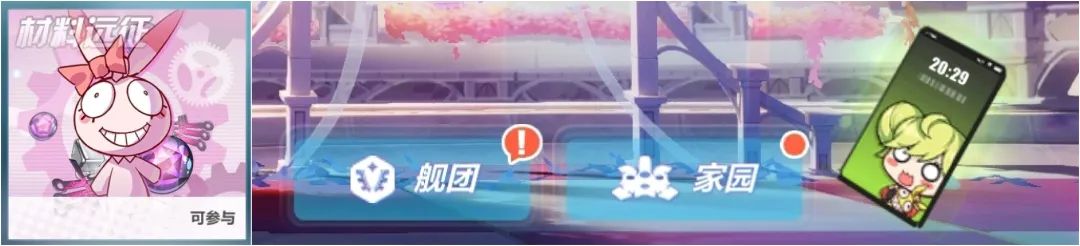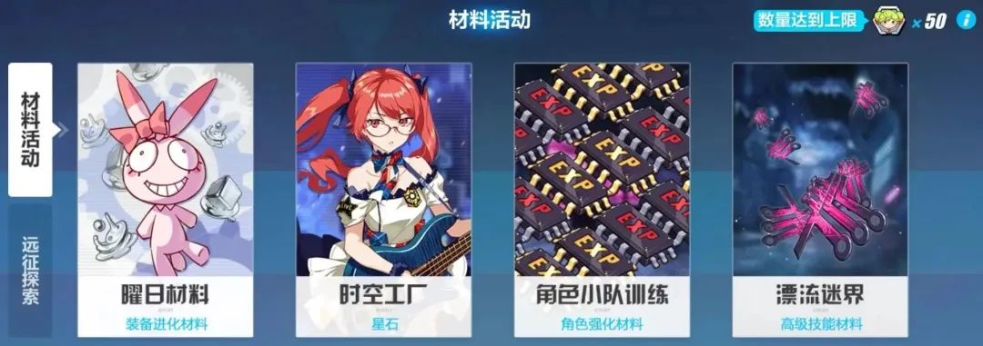 材料远征&家园系统会随着主线的推进开放,这两个玩法可以消耗相应的体力快速获取大量资源,是各类养成材料的主要来源。其中材料远征还拥有扫荡机制,相当省力,建议每天预留一部分体力用于扫荡。