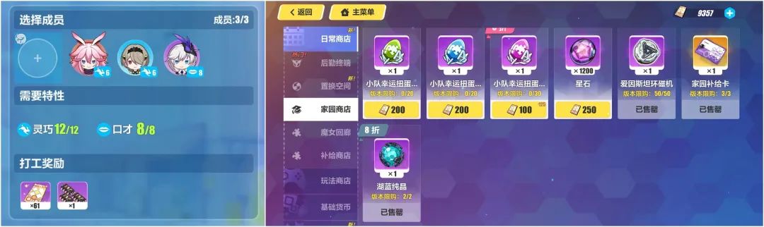 在远征中可以消耗体力派遣女武神获取女武神碎片或养成材料,在打工中则可以消耗饭团派遣女武神获取“金花奖章”,用于在家园商店中购买各种商品。