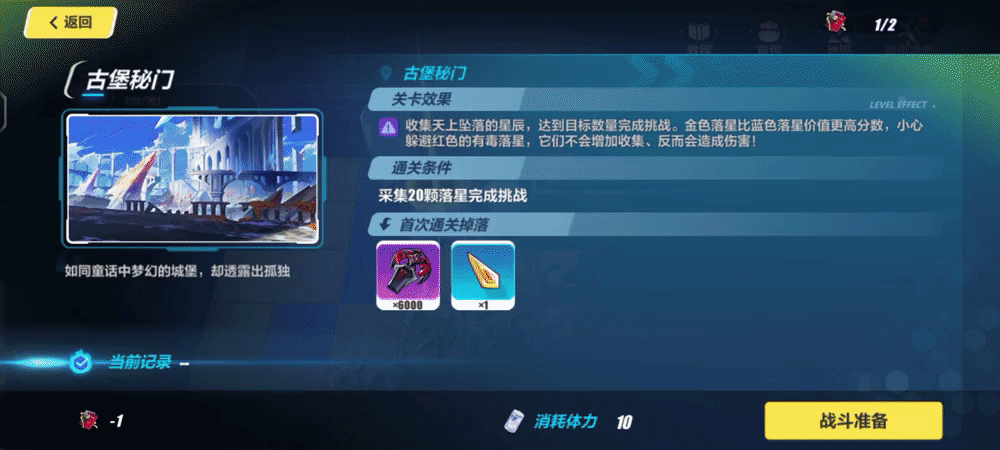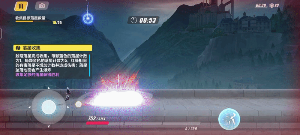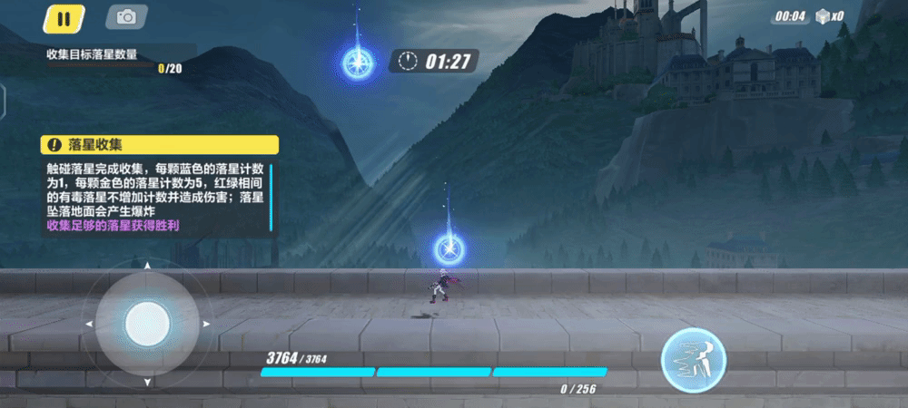 玩家需要在90秒内拾取二十个落星数量,落星共分三种,分别是蓝色、金色和红色,蓝色相当于一个星星,金色相当于五个星星,红色是陷阱,不仅没有星星,还能炸伤角色。每个落星在碰触到地面后都会产生爆炸,伤害很高,离得太近会受到大量伤害,因此玩家需要注意落星的位置。玩法看似简单,实则很难,被击中五次就会阵亡,容错率较低。