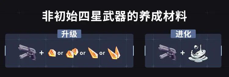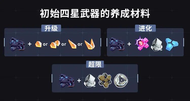 初始四星武器的养成方式主要有【升级】【进化】【超限】三项。其中【超限】为初始四星武器的特殊养成方式,且目前只有部分武器可以进行超限,在下面将对该养成方式做简要说明。