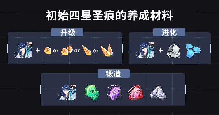 对于初始四星圣痕,其【升级】、【进化】、【锻造】所需的材料如下所示: